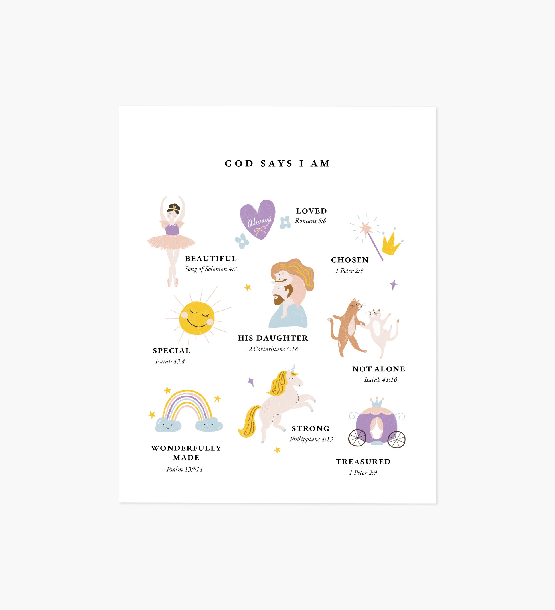 This poster features nine affirmations of who God says they are: Loved, Beautiful, Chosen, His Daughter, Special, Not Alone, Strong, Wonderfully Made, and Treasured. Each affirmation includes a bible verse that confirms the affirmation.
